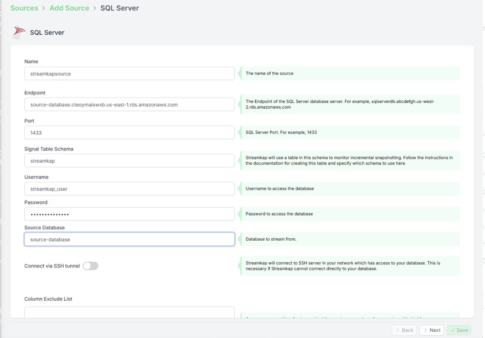 • Адрес сервера SQL Server, порт, имя пользователя и пароль. Рекомендуется создать для Streamkap отдельного пользователя и роль для доступа к вашей базе данных SQL Server. Ознакомьтесь с нашей документацией по конфигурации.